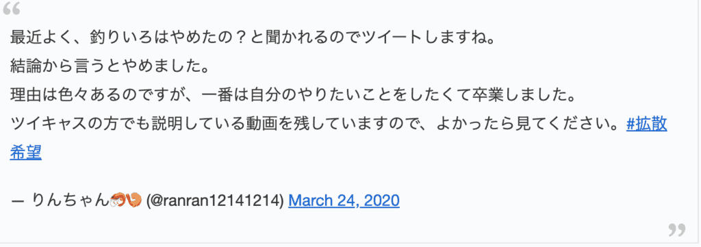 りんりんさんが釣りいろはから脱退を発表したのは、2020年の3月24日でした。突然の発表だったので、私も含めて多くのファンが驚いたと思います。本人は脱退の理由として「やりたいことがある」と話していましたが、具体的な内容までは語られていませんでした。